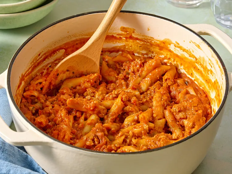 The pasta itself comes out tender but firm—thanks to the one-pot method that allows it to absorb the flavors of the sauce as it cooks. Every forkful delivers a perfect mix of meat, sauce, and herbs. A final touch of Parmesan and fresh basil lifts the entire dish, giving it that authentic Italian finish.